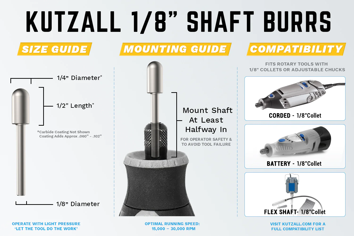 The Kutzall Original tool line provides a fast stock removal with an outstanding finish, making them the most universal and best value of Kutzall tools. The 1/8" shaft burrs are used in flex shaft tools, hand grinders, or other machinery using 1/8" collets or adjustable chucks. They are not prone to loading but may easily be cleaned with solvent or burned clean with a gas torch; the heat won’t harm the teeth.